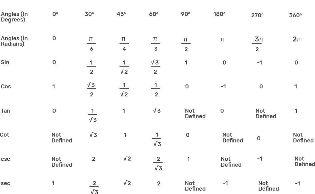 Trigonometric Table - Formula | Trigonometry Ratio Table